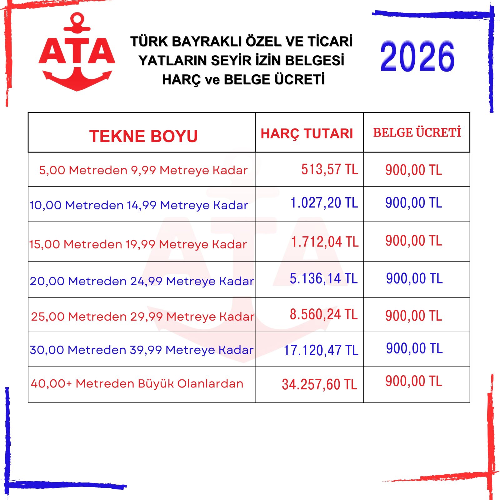 Milli Gemi Sicili, Türk Uluslararası Gemi Sicili ve Bağlama Kütüğüne kayıtlı Türk Bayraklı Ticari ve Özel Yatlardan Seyir İzin Belgelerinden aşağıdaki listeye göre harç alınır.