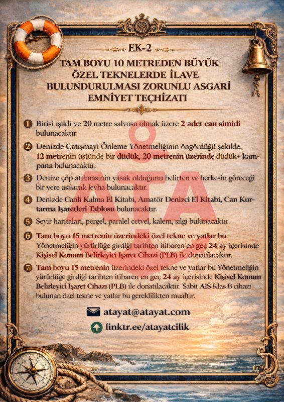 Tam Boyu 10 Metreden Büyük Özel Teknelerde İlave Bulundurulması Zorunlu Asgari Emniyet Teçhizatı